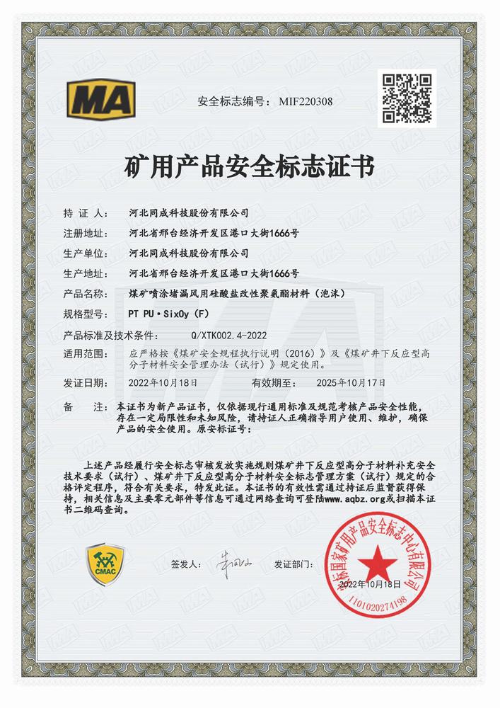 10月19日,同成公司两种产品新取得矿用产品安全标志证书:煤矿喷涂堵漏风用硅酸盐改性聚氨酯材料及煤矿喷涂堵漏风用聚氨酯材料。目前,公司研发的六种矿用高分子注浆材料取得了安标证书,分别是:JG PU煤矿加固煤岩体用聚氨酯材料、JG PU·Six0y煤矿加固煤岩体用改性聚氨酯材料、DS PU煤矿堵水用聚氨酯材料、CT PF煤矿充填密闭用酚醛树脂发泡材料、PT PU·Six0y(F)煤矿喷涂堵漏风用改性聚氨酯材料、PT PU(NF)煤矿喷涂堵漏风用聚氨酯材料。