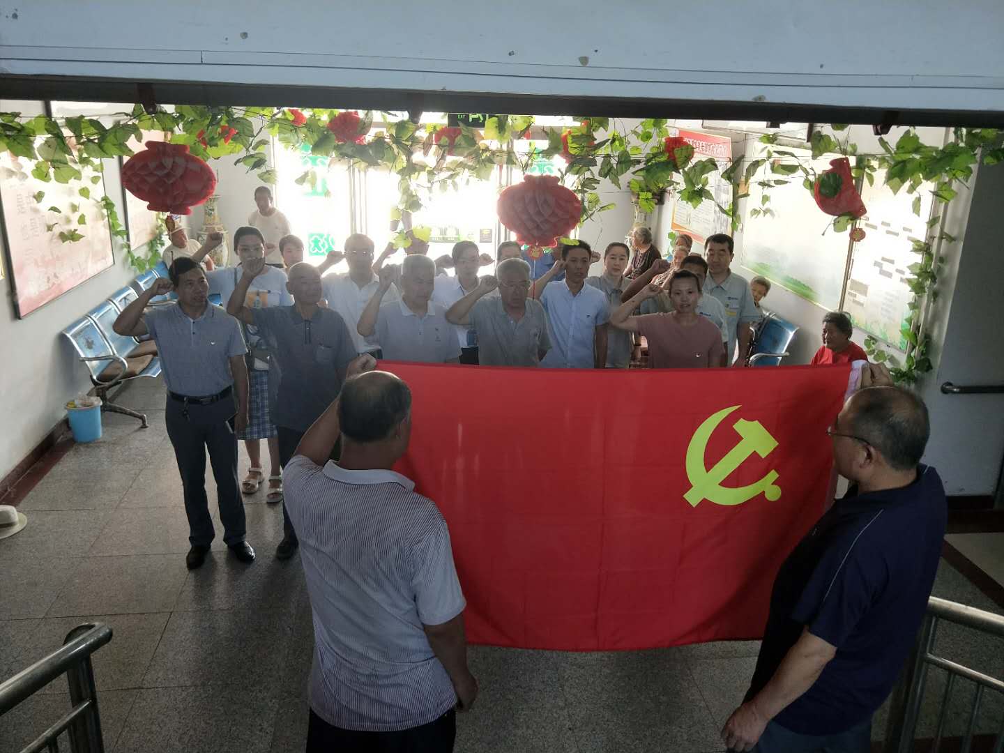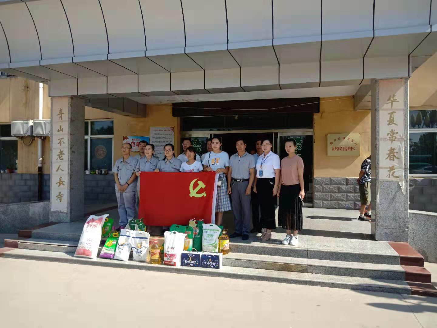 为庆祝中国共产党成立98周年,加强党员思想教育,2019年7月1日上午,在王快镇党政办公室的率领下,同成公司党员及其他公司党员代表一行来到后楼下敬老院开展“七一”慰问老党员活动。公司给敬老院老党员送去了大米、食用油、牛奶及水果等生活用品。并开展了帮助老党员佩戴党徽、打扫卫生,陪同谈心等活动。