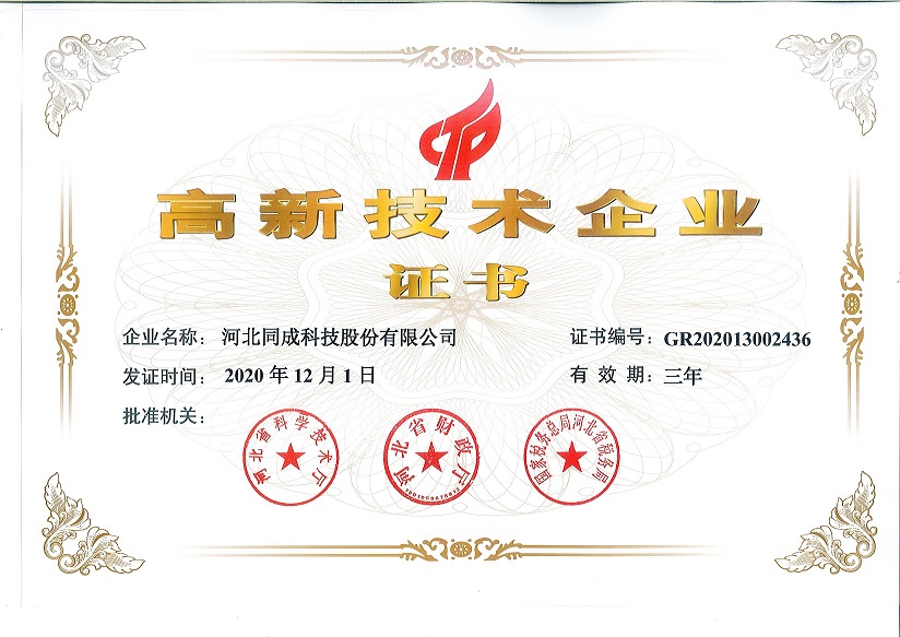 2020年12月1日,河北同成科技股份有限公司被认定为高新技术企业,并于近日获得证书。