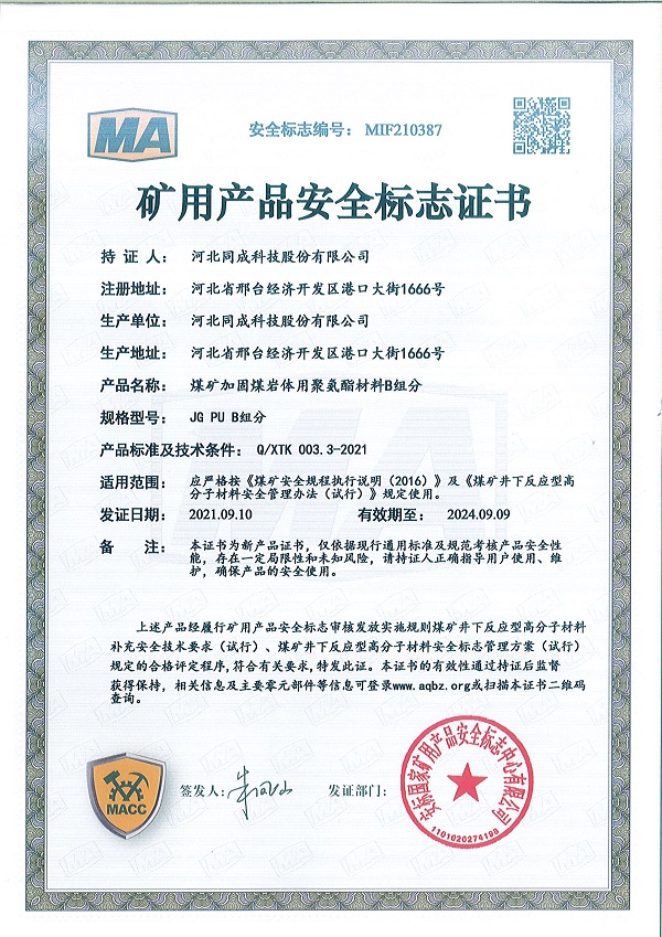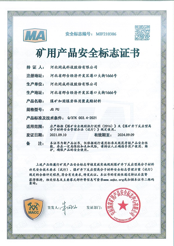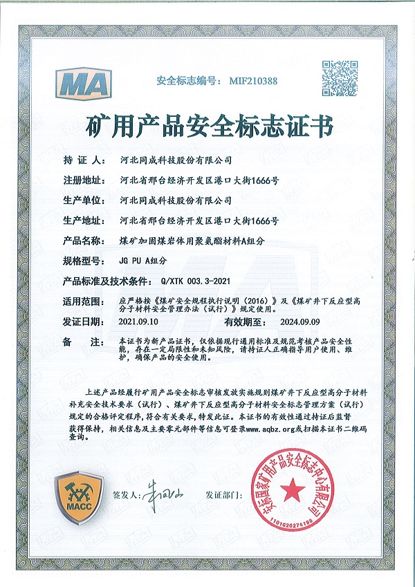 2021年9月16日,公司又一产品成功获得得矿用产品安全标志证书——煤矿加固煤岩体用聚氨酯材料。这是继“煤矿加固煤岩体用硅酸盐改性聚氨酯材料”、“煤矿堵水用聚氨酯材料”取得安标之后,我公司取得的第三项矿用高分子材料安标。