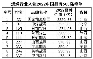 煤炭行业共有9家企业入选《2022中国品牌500强》。具体名单如下: